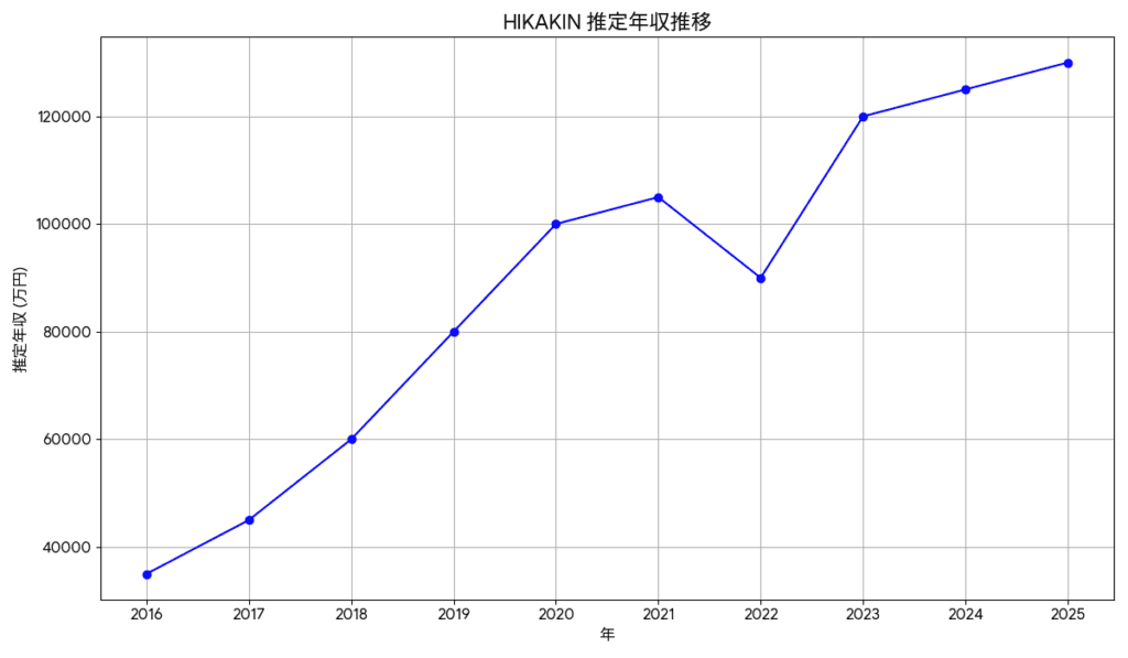 HIKAKIN氏 年収推移サマリー (2016年〜2025年推定)
