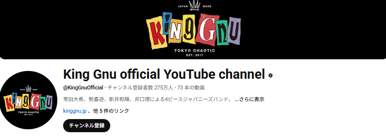 King GnuのYouTubeチャンネル登録者数は275万人、総再生回数は23億回を突破しています。「白日」MVは3億回再生、「SPECIALZ」MVは1億回再生を超えるなど、多くのMVが数千万〜億単位の再生回数を記録しています。YouTube広告収入の相場は1再生あたり0.05円~0.1円程度ですが、この莫大な再生回数から、数千万円規模の広告収入を得ていると考えられます。