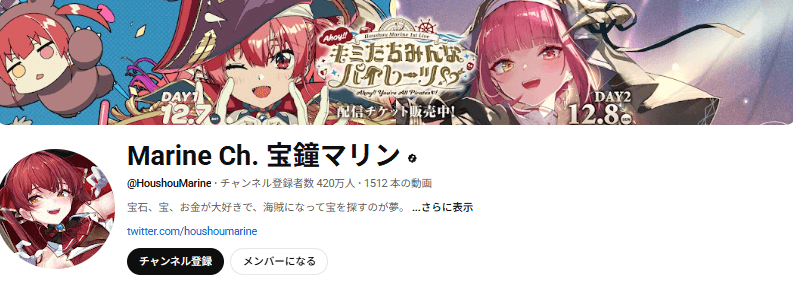 宝鐘マリンさんはYouTube(広告・スパチャ・メンバー)とライブ&グッズが年収の大黒柱のトップVTuberです。