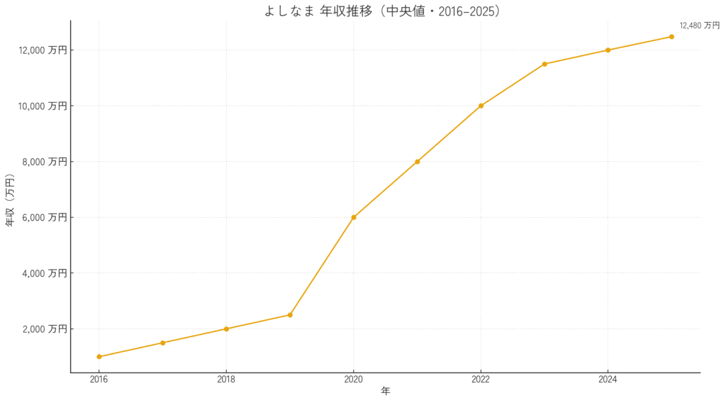 登録者100万人を突破した2020年が明確な転機で、以降は企業案件とイベント露出が押し上げ役になりました。